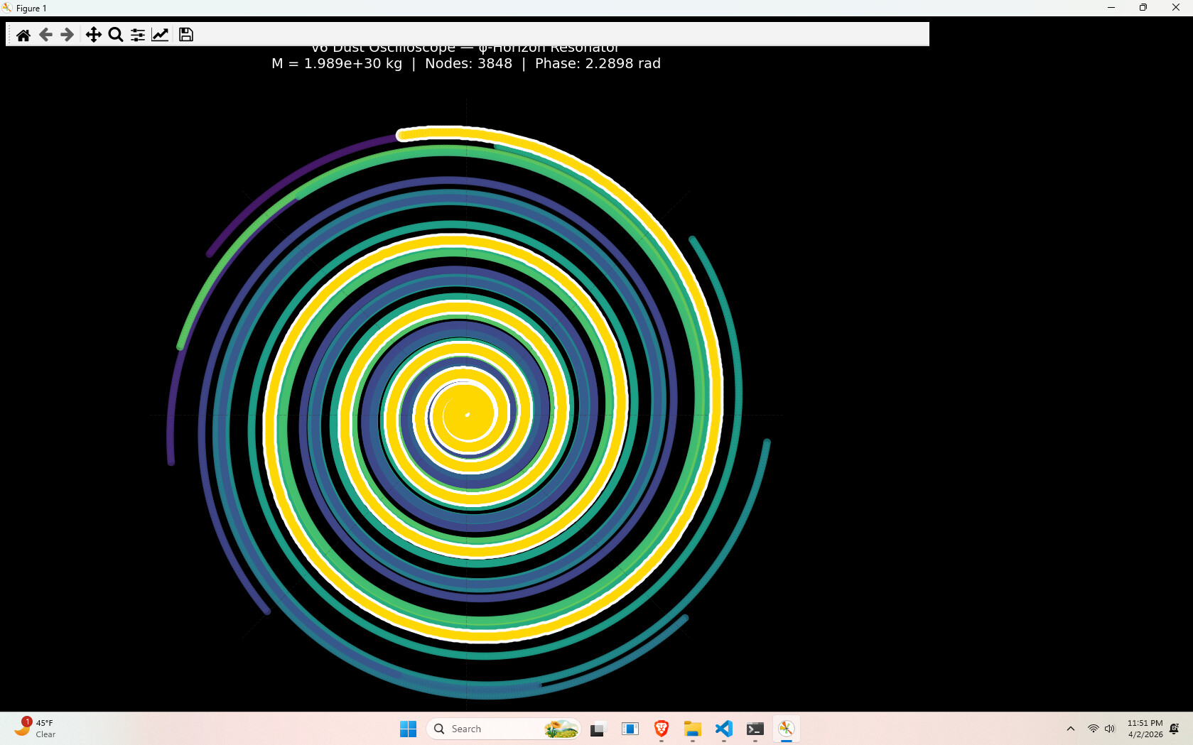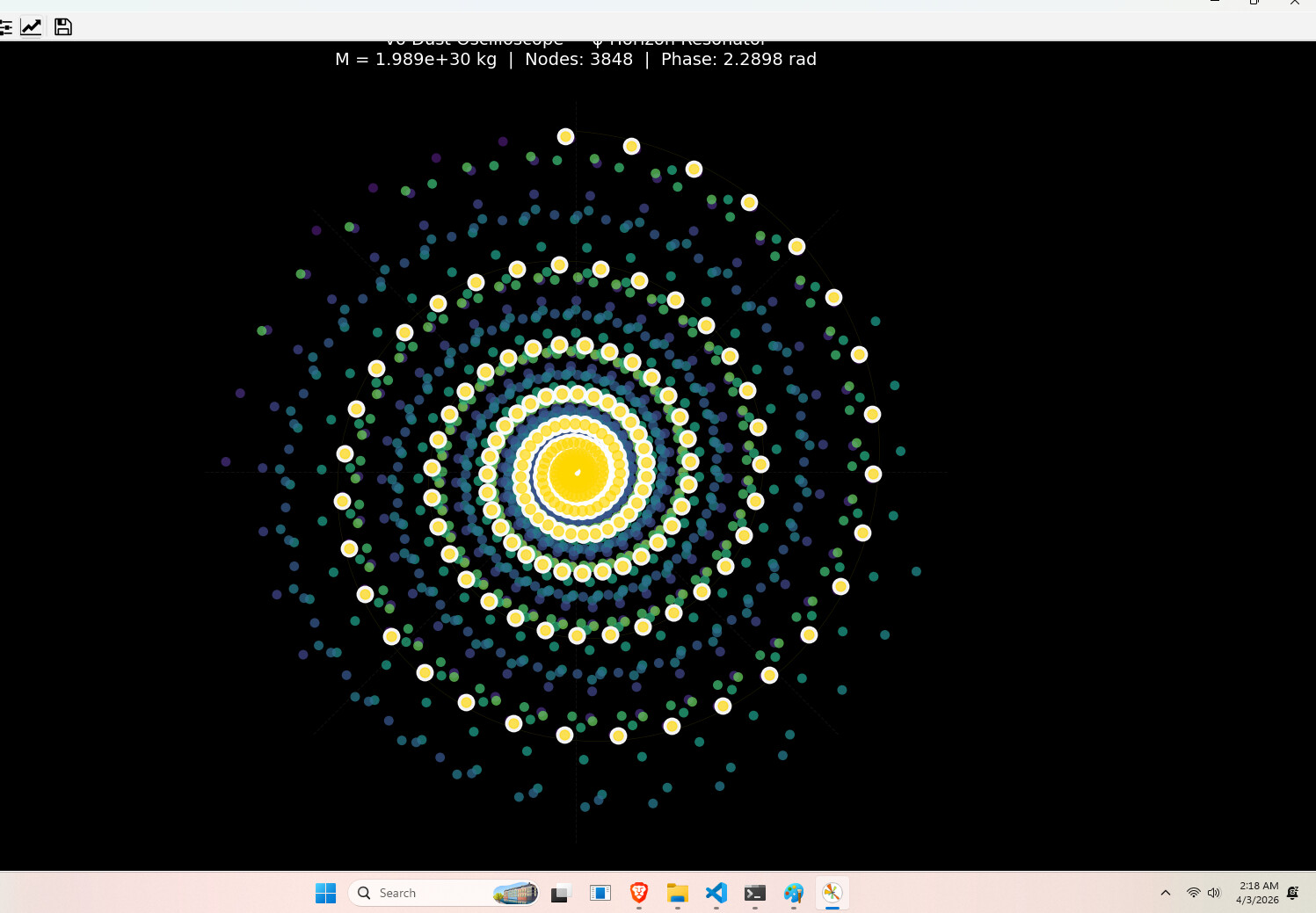 f'M = {M_kg:.3e} kg | Nodes: {resonance_nodes} | Phase: {global_phase:.4f} rad',