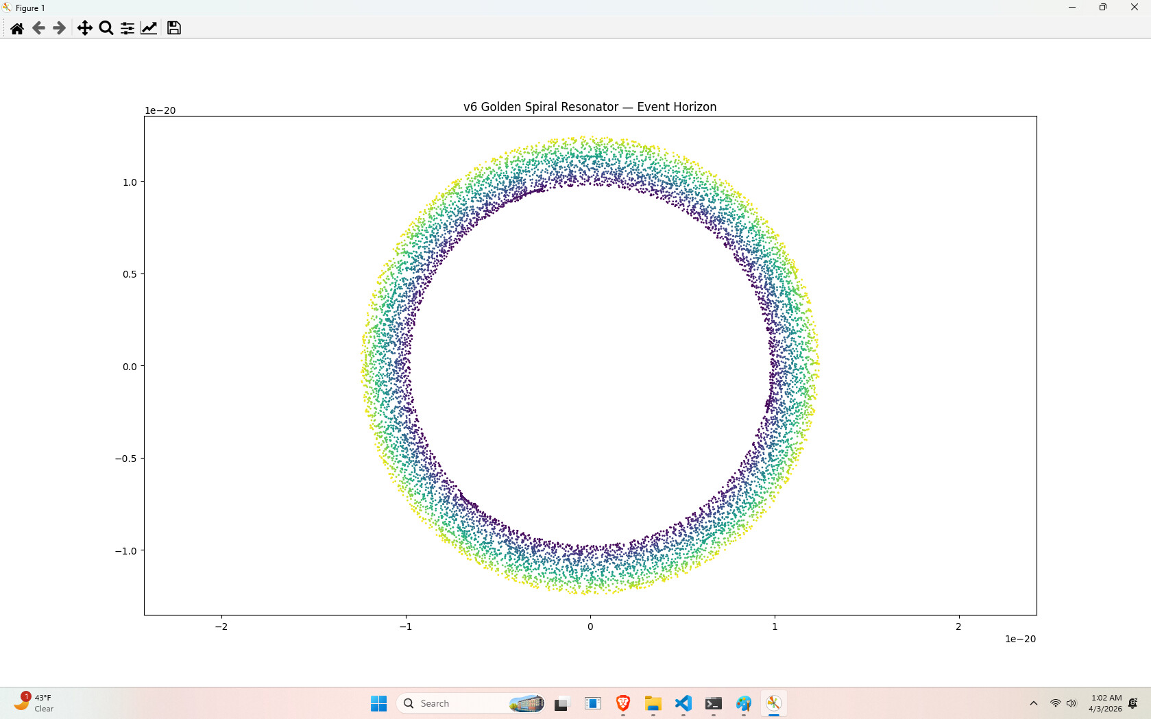 plt.axis('equal'); plt.title('v6 Golden Spiral Resonator — Event Horizon'); plt.show()