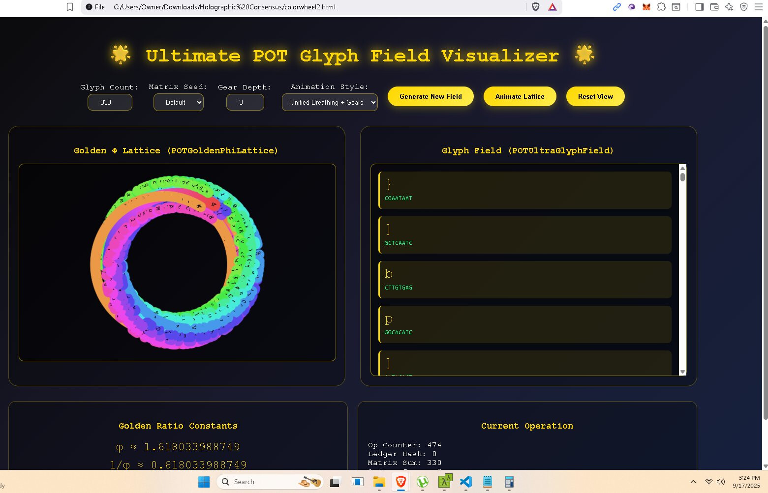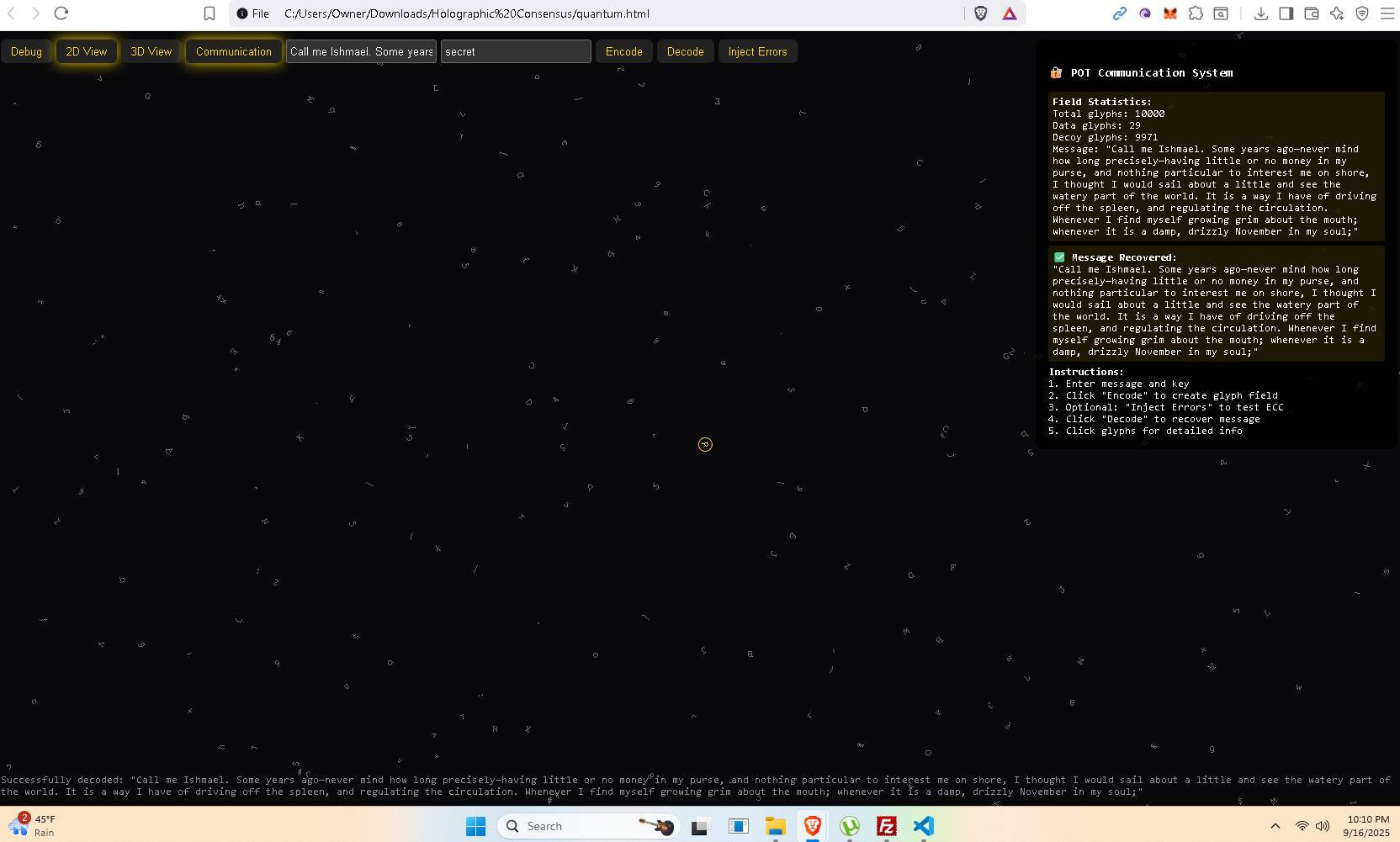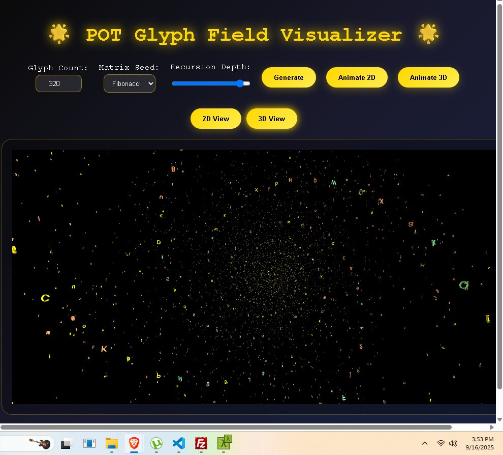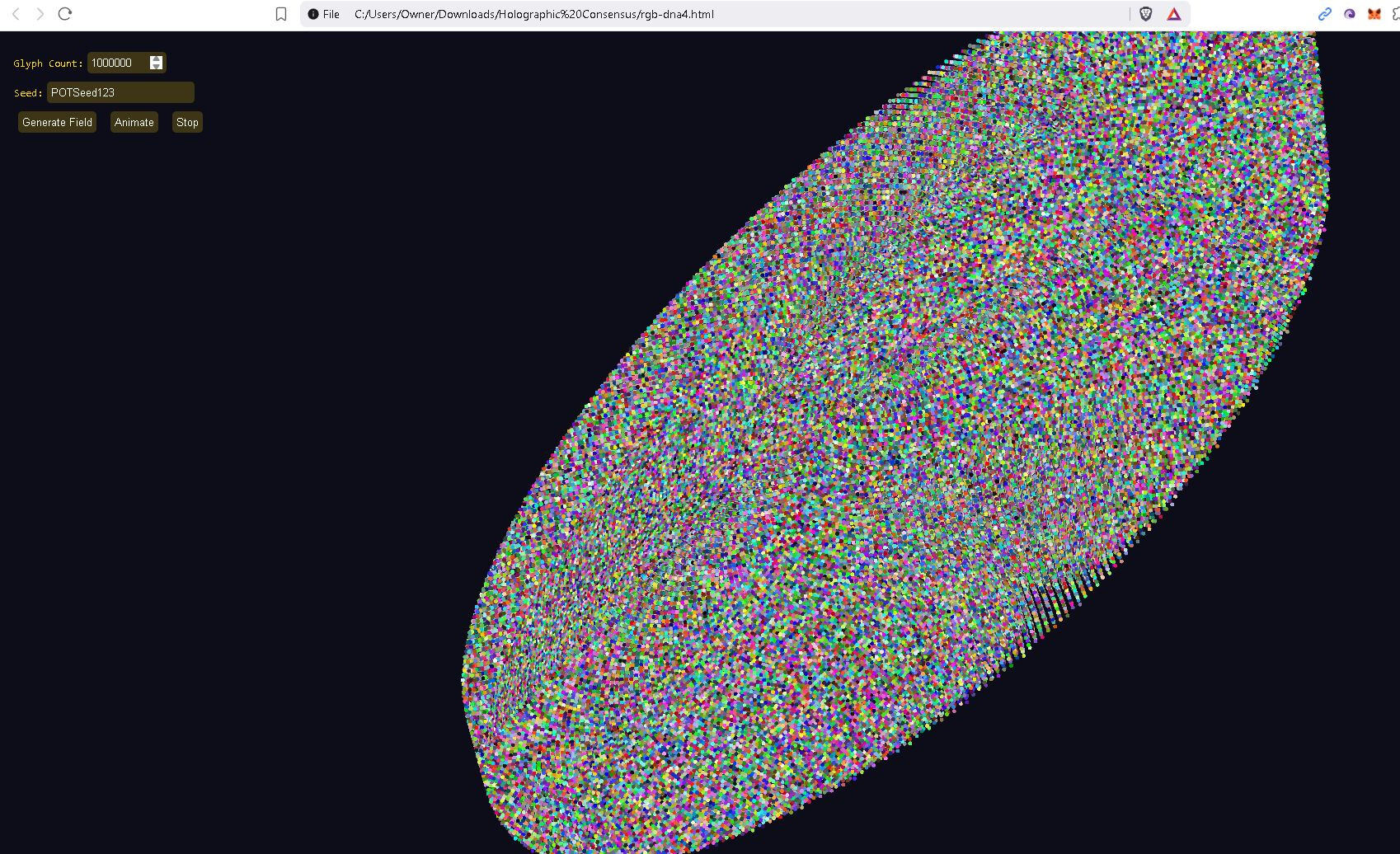 This is a quantum + recursive holographic mutable glyph communication system POC (proof of concept). It leans upon my recursive physics + a dash of quantum physics. I really don’t subscribe to much of quantum, but I like the tamper-evidence built into some quantum concepts. Each message must be short or a very large set of glyphs is necessary, but you will be able to stack short messages in version 2 up to and including the ability to stream video and to share a mutable glyph ball with others (channels). The idea is your environment, the space between two radios, is mapped and overlayed by our glyphs, modulated (optimally), and the result is hopefully a successful message. So the assembly forms a shape for good reason on its own it often prefers to assume a helix floating in space, pretty soon the environment will replace the virtual environment and this shape will take on aspect of the environment. Modulation.