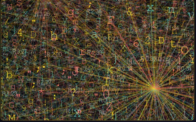 Sort of looks like the beginnings of a hologram, doesn’t it? 30,000 stacked characters and their respective strings pointing to one vanishing point.