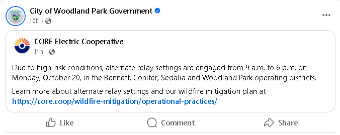 Due to high-risk conditions, CORE’s alternate relay settings are now engaged until 6 p.m. in the Woodland Park district, causing lines to de-energize the instant a fault, such as a branch or a tree...