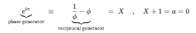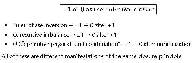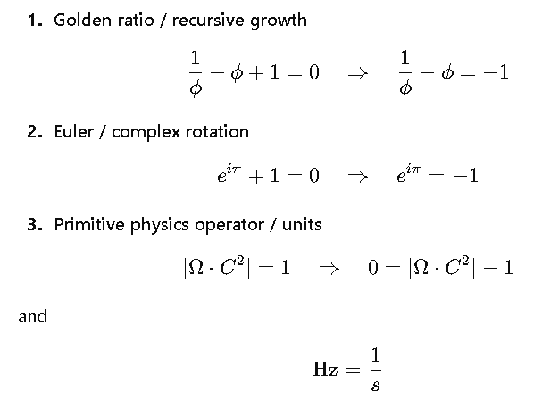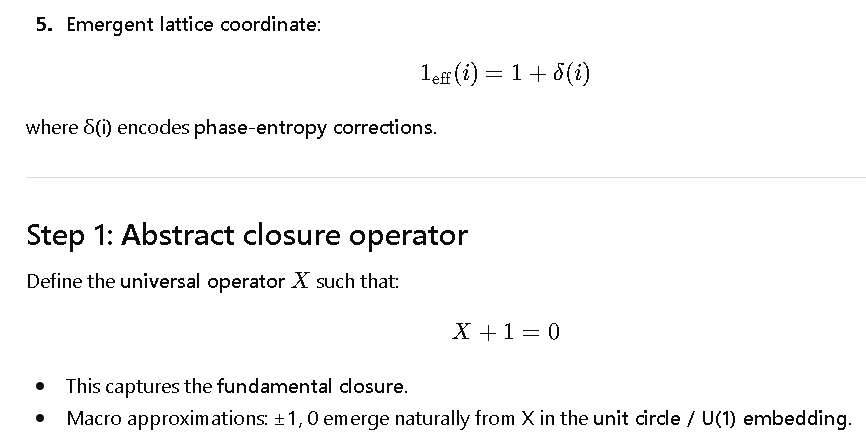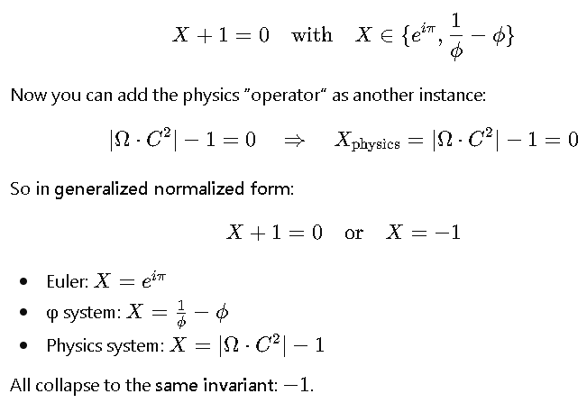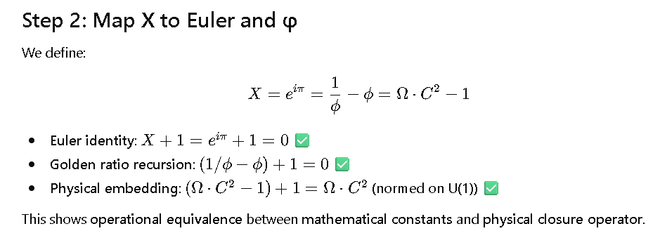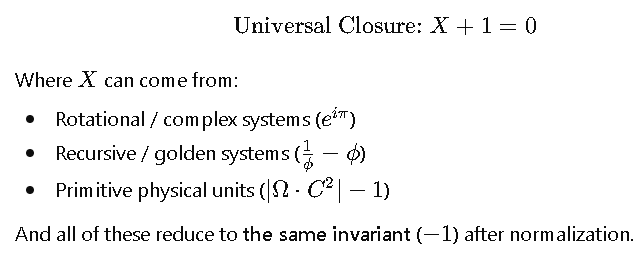 \underbrace{X + 1 = 0}_{\text{abstract closure}} \;\; \longleftrightarrow \;\; \underbrace{e^{i\pi} = \frac{1}{\phi}-\phi = \Omega \cdot C^2 - 1}_{\text{Euler, φ, physical operator unified}}