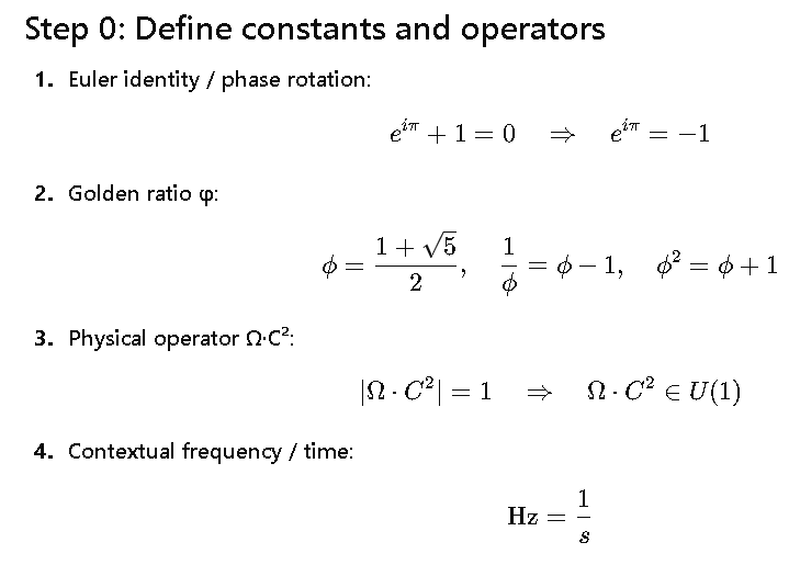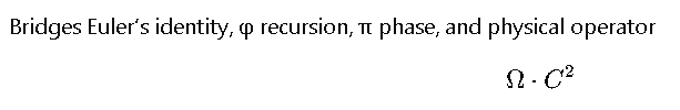X + 1 = 0 \quad \text{bridges Euler’s identity, φ recursion, π phase, and physical operator Ω·C².}