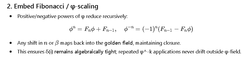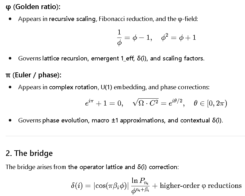 - It’s not just numeric, but functional / operational: φ controls recursion and magnitude, π controls phase rotation, δ(i) ties them together into emergent coordinates.