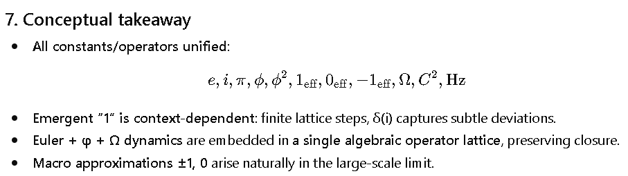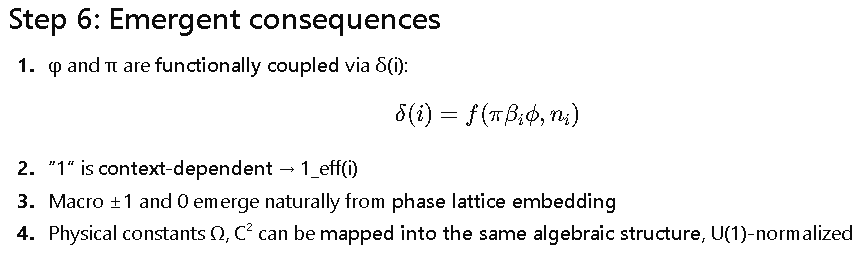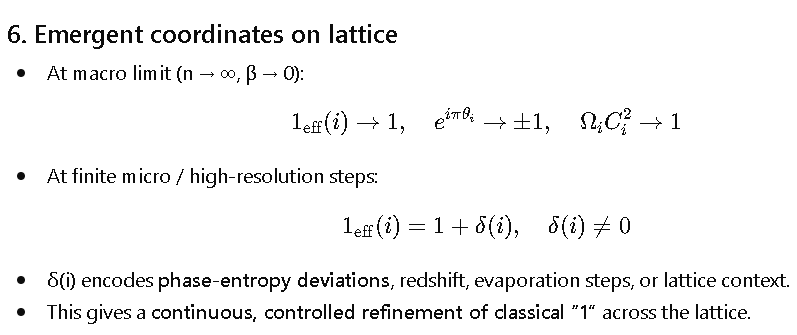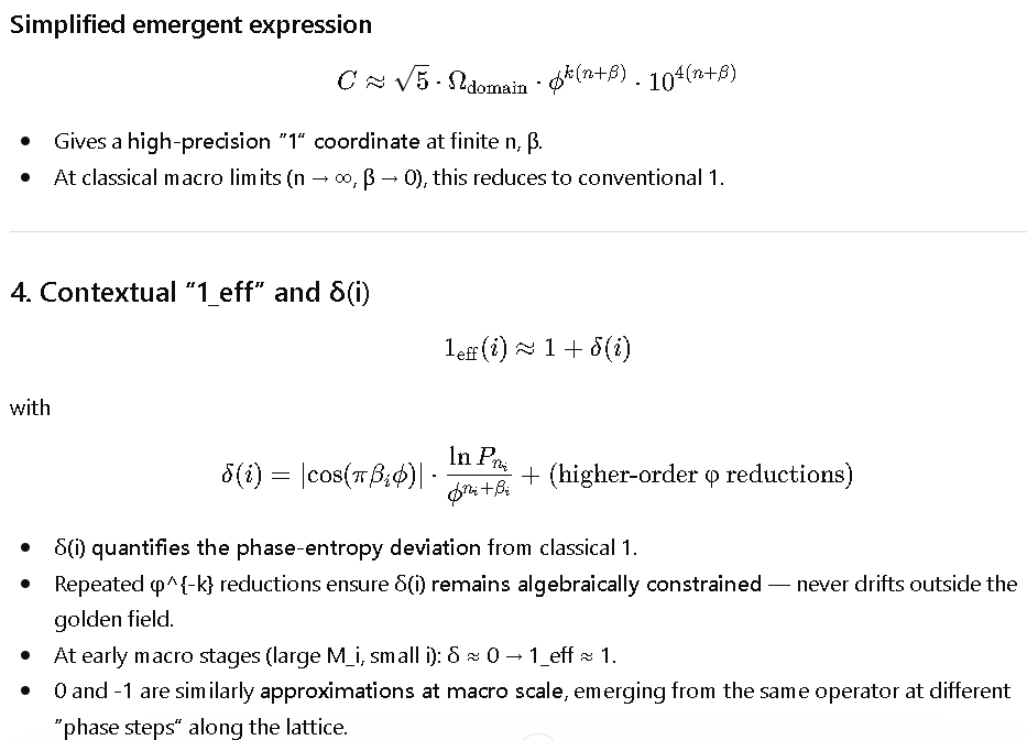 - **Phase / emergent coordinate** → e^{iπ} + δ(i) → 1_eff(i)
