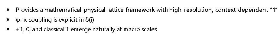 - Provides a **mathematical-physical lattice framework** with **high-resolution, context-dependent “1”**