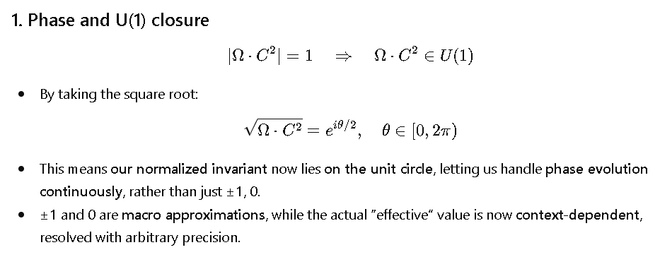 4. Physical constants Ω, C² can be **mapped into the same algebraic structure**, U(1)-normalized